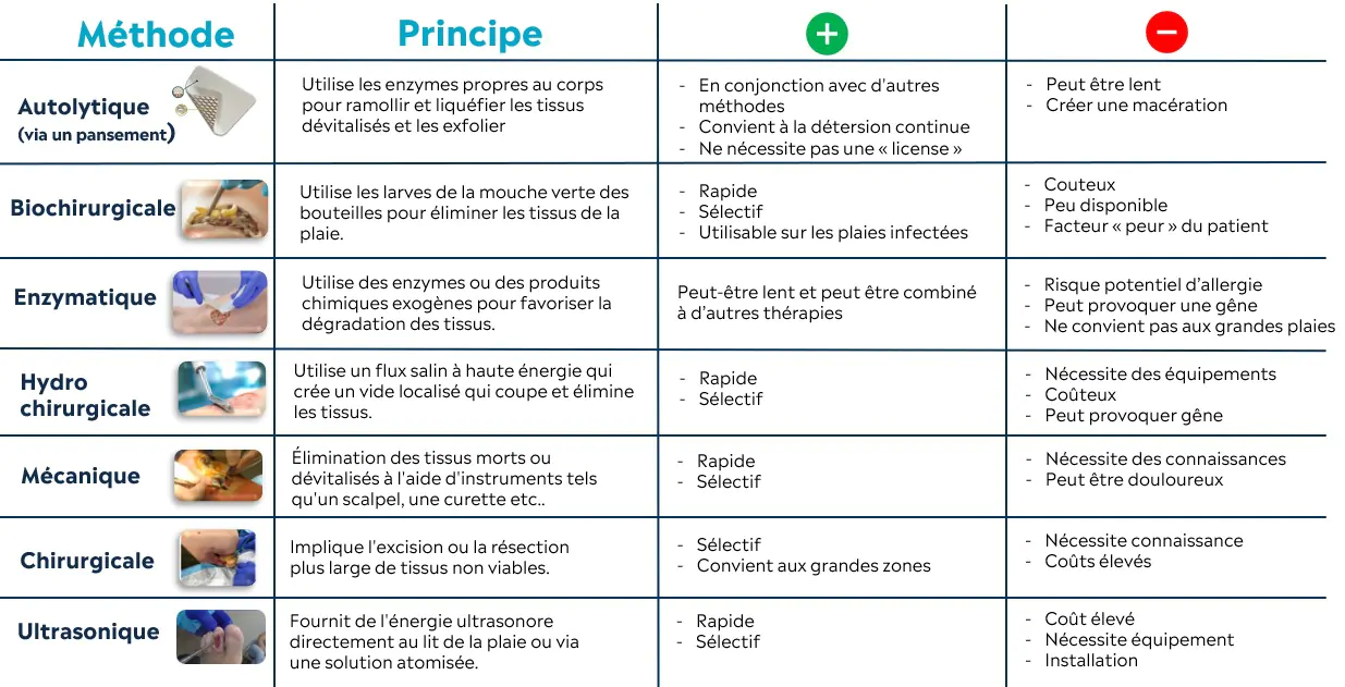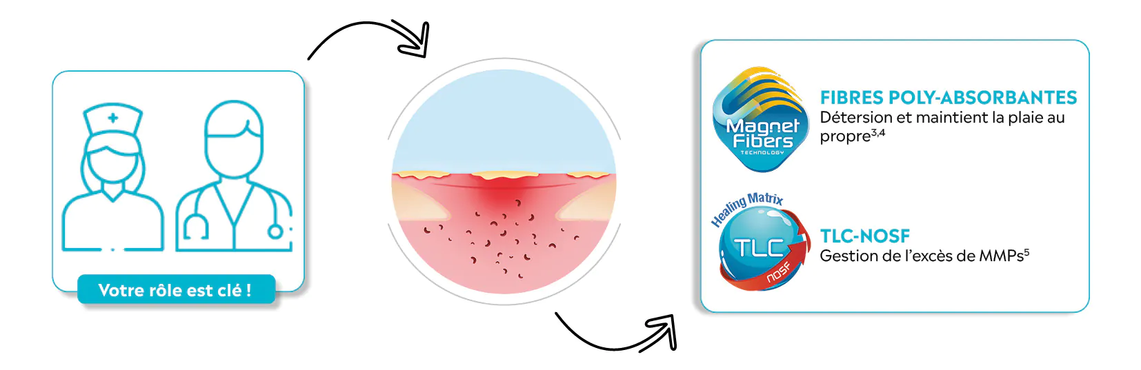 Le nettoyage de la plaie La détersion Les différentes méthodes de détersion Un enjeu au niveau local de la plaie La détersion, une étape clé pour favoriser la cicatrisation des plaies Avant d’envisager une prise en charge efficace, il est indispensable de préparer correctement la plaie. La détersion joue ici un rôle clé pour créer un environnement propice à la cicatrisation. Le nettoyage de la plaie Le nettoyage de la plaie précède la détersion dans le cadre de la préparation du lit de la plaie et permet une élimination active des contaminants de surface, des débris détachés, des tissus non viables non fixés, des micro-organismes ou des restes de pansements précédents du lit de la plaie, des bords de la plaie, de la zone péri-lésionnelle et de la peau environnante. Selon la technique et la concentration de la solution nettoyante utilisée, elle peut également ramollir et aider à l'élimination des tissus nécrotiques et des fibromes. Plusieurs considérations lors de la sélection des options de nettoyage de la plaie : • Eau et savon : standard de traitement • Peroxyde d'hydrogène, Dakin et chlorhexidine : peuvent entraver la cicatrisation des plaies en endommageant les fibroblastes et les kératinocytes, qui sont essentiels à la réparation des tissus. • Iode : peut-être cytotoxique et retarder la cicatrisation des plaies, en particulier dans les plaies étendues ou chroniques. • Solutions à base d'alcool : peuvent déshydrater les tissus et provoquer la mort cellulaire, ce qui entrave le processus de cicatrisation des plaies. • Solution saline : Sûre mais pas efficace pour réduire les niveaux de micro-organismes • Acide hypochloreux pur (pHA) : Sûr, contre les agents pathogènes courants, notamment les champignons, les spores et les souches bactériennes multirésistantes aux médicaments. La détersion La détersion correspond à l’élimination des tissus viables et non viables, y compris les matières nécrotiques, la fibrine, les micro-organismes, les biofilms et les contaminants d'une plaie ou adjacents à celle-ci. C’est une étape clé de la préparation du lit de la plaie. Une considération importante pour toutes les plaies, en particulier lorsque des tissus nécrotiques ou d'autres tissus non viables sont présents dans le lit de la plaie. La détersion favorise la cicatrisation des plaies Cette étape indispensable favorise le bourgeonnement et la cicatrisation des plaies : • Elimine les obstacles à la cicatrisation • Aide à réduire la charge microbiologique, y compris le biofilm • Stabilise le microbiome de la peau péri-lésionnelle • Réduit le risque d'infection récurrente • Permet une évaluation correcte de la plaie Des précautions à prendre Certaines plaies et conditions du patient nécessitent des précautions : • Zones à haut risque (par exemple plaies aux mains, aux pieds ou au visage) • Ischémie des membres • Malignité suspectée • Vaisseaux sanguins, nerfs, tendons ou os exposés (ou à proximité immédiate) • Affections inflammatoires telles que pyoderma gangrenosum • Implant prothétique à proximité de la plaie • Troubles de la coagulation sanguine • Fistules de dialyse • Calciphylaxie non traitée • Douleur extrême de la plaie Les différentes méthodes de détersion Un enjeu au niveau local de la plaie : la gestion de la fibrine et de l’exsudat Les MMPs1 (Métalloprotéinases matricielles) sont des facteurs locaux invisibles, présents au niveau des plaies, qui entrainent des retards de cicatrisation. Un excès de MMPs important génère indirectement des exsudats et de la fibrine. Au niveau de la plaie, la gestion de la fibrine et des exsudats est cruciale. La TLC-NOSF2 est une technologie qui gère cet excès de MMPs, et donc, indirectement la production de fibrine et d’exsudats. Découvrez les solutions Urgo Medical URGOSTART PLUS BORDER Pansement hydrocellulaire adhésif à forte capacité d’absorption, avec fibres polyabsorbantes et matrice TLC-NOSF. Non substituable. Découvrir ce produit URGOSTART PLUS ABSORB Pansement hydrocellulaire non adhésif à forte capacité d’absorption, avec fibres polyabsorbantes et matrice TLC-NOSF. Non substituable. Découvrir ce produit URGOSTART PLUS COMPRESSE Pansement hydrocellulaire non adhésif avec fibres polyabsorbantes et matrice TLC-NOSF. Non substituable. Découvrir ce produit Découvrez du contenu de la même catégorie Publié le 18 septembre 2025 Exsudat Physiopathologie des plaies exsudatives Lire la suite Publié le 14 octobre 2025 Exsudat Le diagnostic clinique d’une plaie exsudative Lire la suite Publié le 14 octobre 2025 Exsudat Soins locaux d’une plaie exsudative Lire la suite 1. Métalloprotéinases matricielles 2. TLC-NOSF : Technologie Lipido-Colloïde - Nano OligoSaccharide Factor (KSOS : Sel de Sucrose Octasulfate de Potassium). 3. Meaume S, Dissemond J, Addala A. Evaluation of two fibrous wound dressings for the management of leg ulcers: results of a European randomised controlled trial (EARTH RCT). J Wound Care 2014; 23: 3, 105– 116. 4. Sigal ML, Addala A, Maillard H, Chahim M, Sala F, Blaise S, Dalac S, Meaume S, Bohbot S, Tumba C, Tacca O. Clinical evaluation of a new TLC-NOSF dressing with poly-absorbent fibers for the local management of exuding leg ulcers, at the different stages of the healing process: Results from two multicentric, single-arm, prospective, open-label clinical trials. J Wound Care 2019: 28(3) :164-175. 5. Lázaro JL, Izzo V, Meaume S, Davies AH, Lobman R, Uccioli L. Elevated levels or matrix metalloproteinases and chronic wound healing: an updated review of clinical evidence. J Wound Care 2016: 25(5):277-287