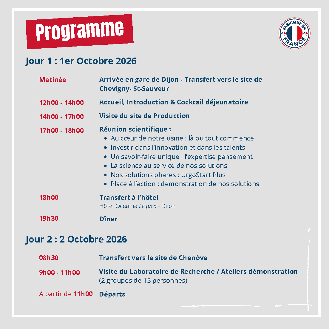 Cet événement exceptionnel a été conçu pour vous offrir un accès privilégié à l’univers et aux coulisses de notre entreprise. Nous vous ouvrirons les portes de notre site industriel et logistique de Chevigny-Saint-Sauveur et de notre Laboratoire R&D de Chenôve afin de vous faire découvrir, en exclusivité, les différentes étapes, de la recherche à la fabrication de nos produits à haute valeur ajoutée. Accompagnés par nos équipes, vous plongerez au cœur de nos ateliers, rencontrerez les femmes et les hommes passionnés qui donnent vie à notre expertise, et profiterez d’échanges privilégiés autour de nos métiers, de nos innovations et de notre savoir-faire.